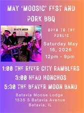 Live music and pork bbq event at the Batavia Moose Lodge outdoor venue. Bring your own chairs and come out and enjoy 3 bands and a pork bbq dinner (donations appreciated). Drinks available for purchase (no outside alcohol allowed). Our venue has plenty of shade and a place for the kids to play.